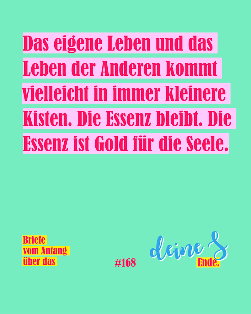 Lieber A., Das eigene Leben und das Leben der Anderen kommt vielleicht in immer kleinere Kisten. Die Essenz bleibt. Die Essenz ist Gold für die Seele.Deine S.