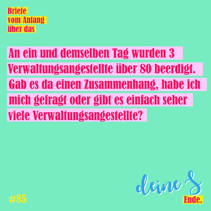 Die verschiedenen Friedhöfe der Stadt - es handelt sich nicht um die Stadt, in der ich wohne - sind dort alphabetisch aufgelistet und dann die zu bestattenden Menschen für den jeweiligen Tag. Das steht immer der Friedhof, dann die Uhrzeit, der Name, der Beruf und dann das Alter. Ich studiere das Kästchen von rechts nach links. Alle Beerdigungen von Menschen über 80 kann ich irgendwie verkraften, alle Zahlen, die kleiner als 80 sind und da stehen verursachen mir Herzrasen. Dann gibt es Abstufungen: Unter 50 dann unter 30, dann unter 18. Diese Abstufungen sind an den Grad meines Herzrasens geknüpft. Niemand hat mir diese Kategorien beigebracht. Sie sind in mir als Wahrheiten. Klar ist das subjektiv, das weiß ich doch!