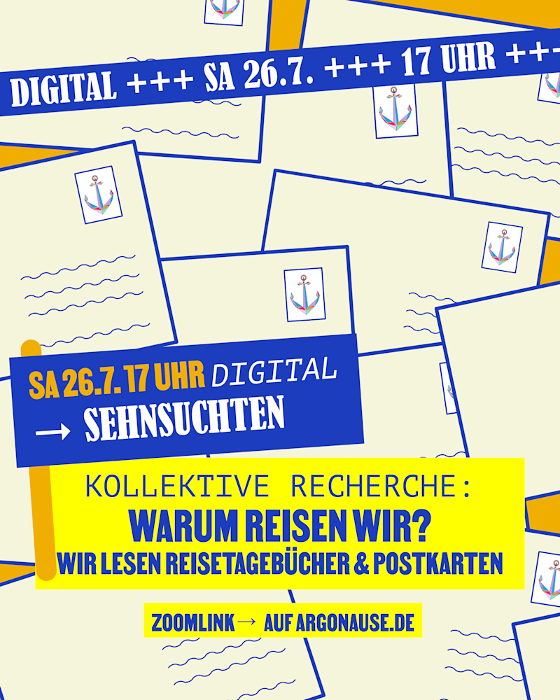Unsere nächste Station auf dem gedanklichen Rechercheschiff: Warum reisen wir? Für uns, für die anderen? Wir wollen kollektiv vom Reisen träumen, eure Post und Postkarten lesen und uns damit etwas Wind um die Nase wehen lassen. Die bessere Reise imaginieren und miteinander sprechen.