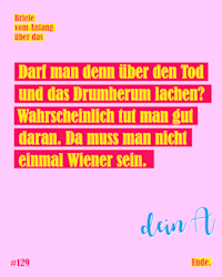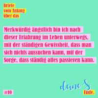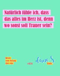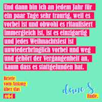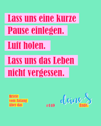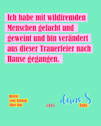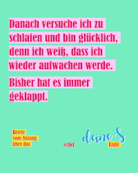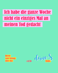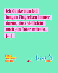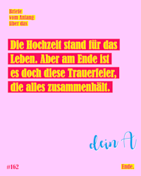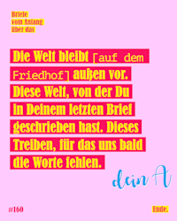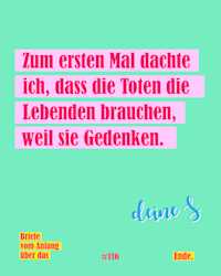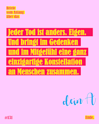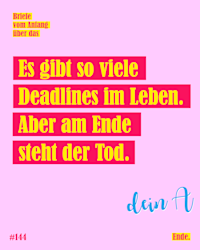 In ihren „Briefe vom Anfang über das Ende" schreiben sich die Autor*innen, Sabrina Zwach und Andreas Kaufmann, Briefe über Tod, Trauer und Sterben. Die beiden schreiben – weil es bei diesem Thema einfacher ist als sprechen – über die verschiedensten Aspekte des Lebensendes und Zurückbleibens.