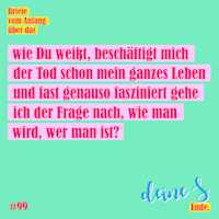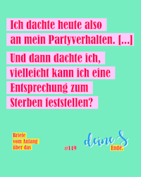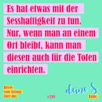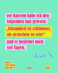 Die Briefe sollen Einblicke in den unterschiedlichen Umgang mit dem Tod und mit dem Sterben geben. Die beiden Schreibenden kennen sich seit der frühesten Jugend, haben ihre jeweiligen Lebenswege verfolgt und Freud und Leid oft geteilt. Sie haben Angehörige verloren, einen Bruder, die Mutter, nahe Freunde und sich auf den Beerdigungen in den Armen gelegen. Die beiden haben geschrieben und Fotos gesammelt. Nun soll der Briefwechsel aus der digitalen in die analoge Welt gebracht werden.