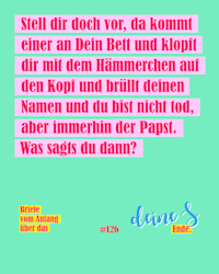 Herauskommen soll ein Lesebuch, ein Bilderbuch, eine Anregung, ein Angstnehmer-Buch, ein Kunstbuch, ein Buch, das keinem Genre zuzuordnen ist, und doch absolut Sinn macht. Geplante Gesamtlänge: ca. 100 Seiten
